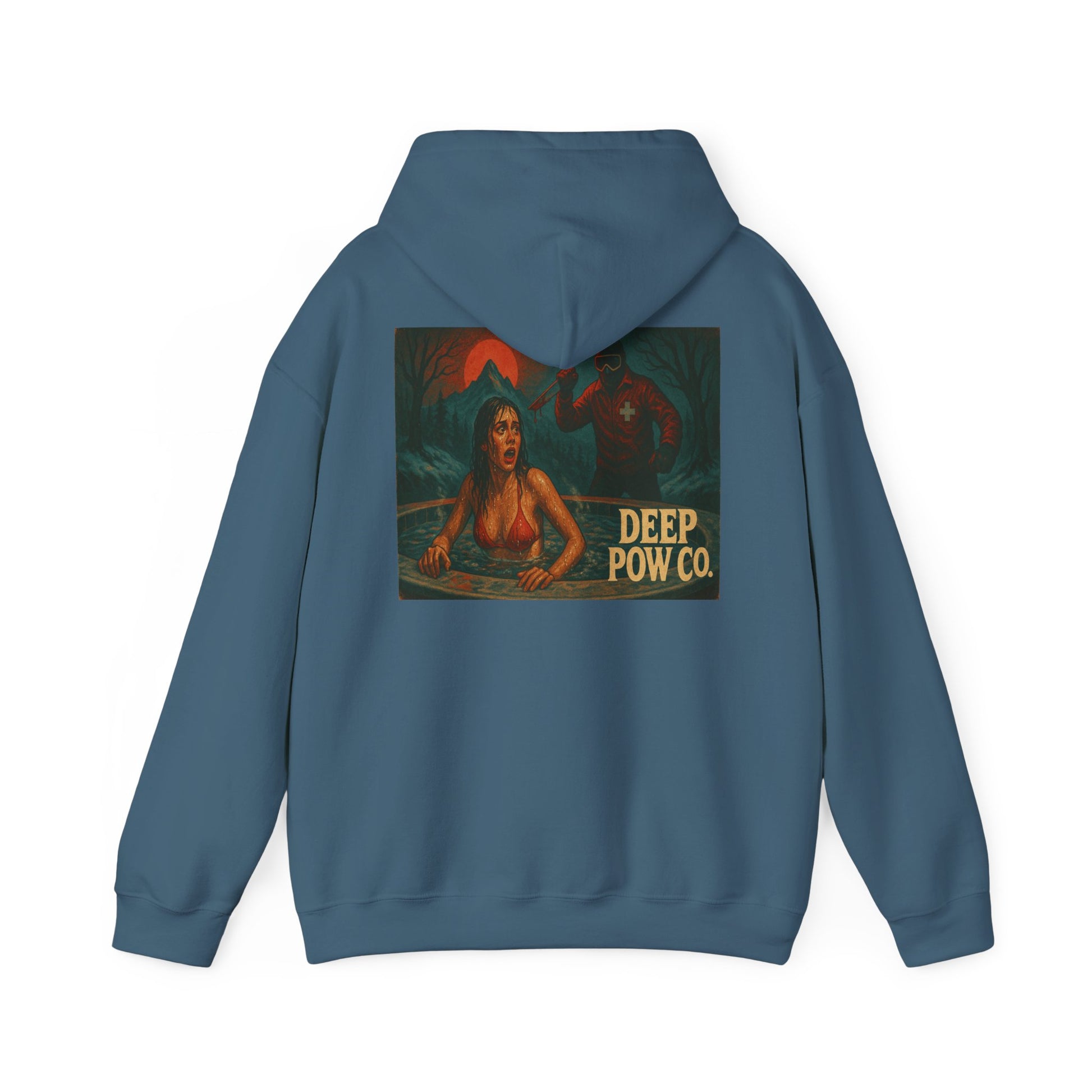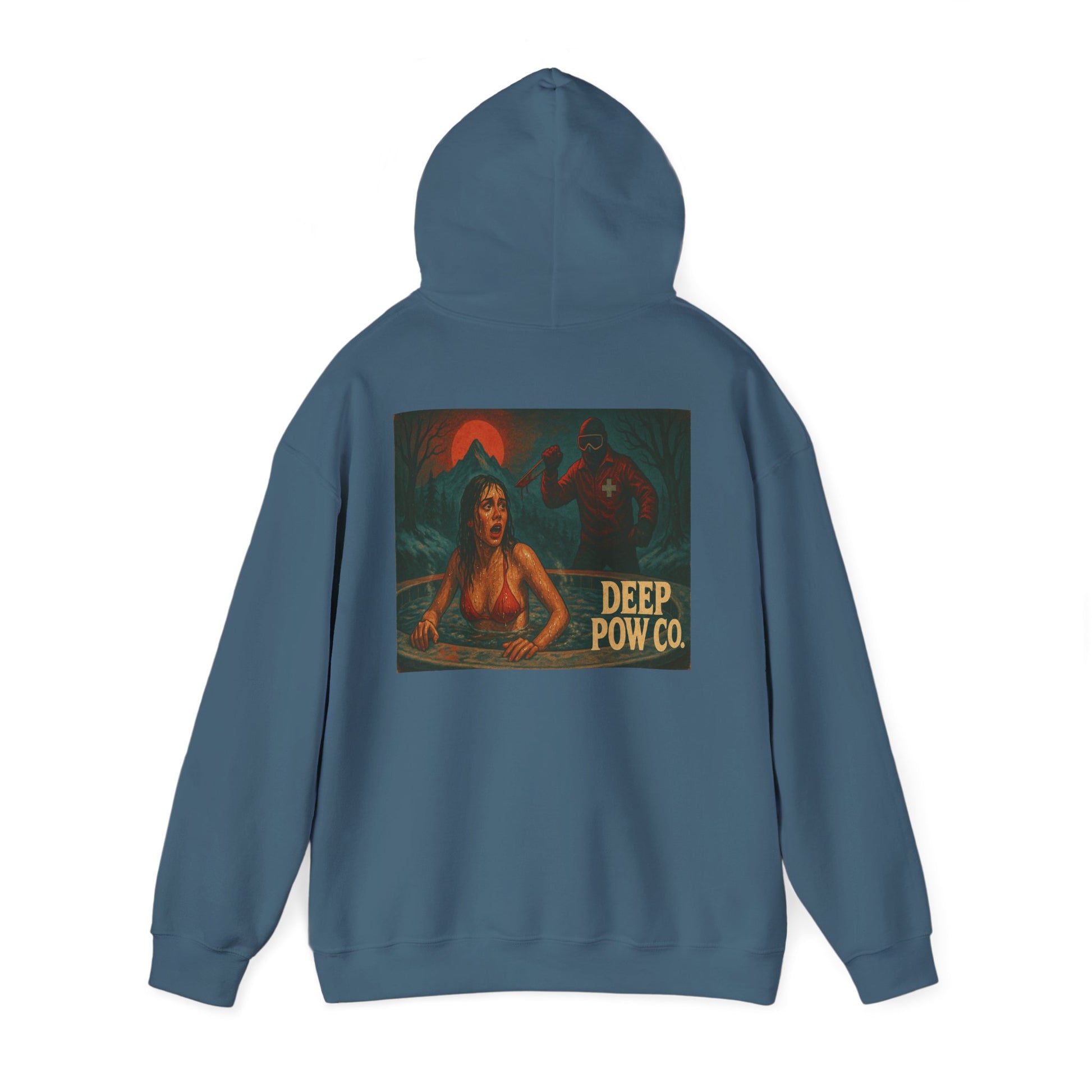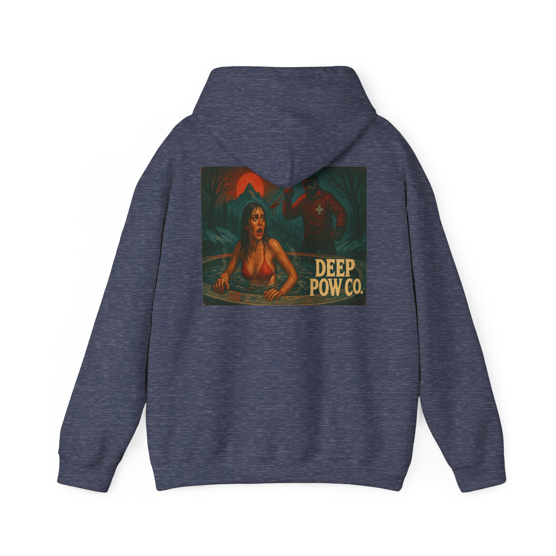 Bring the mountain slasher legend to life with the Hot Tub Horror hoodie from Deep Pow Co. Inspired by 80s horror movies and retro ski culture, this graphic hoodie blends vintage style, bold distressed colors, and classic grindhouse vibes. Perfect for powder days, après-ski hangs, and horror fans who love deep snow and deeper cuts.